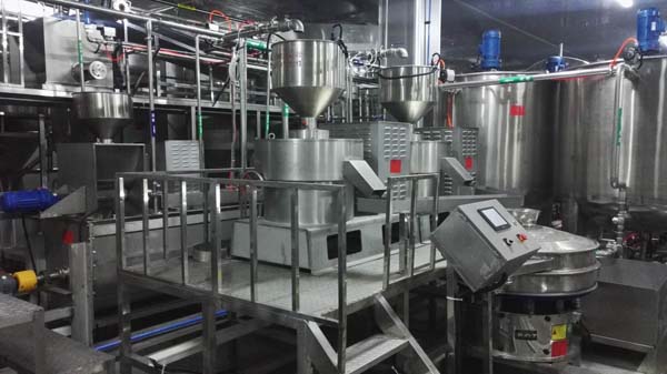 本生產(chǎn)線(xiàn)的調(diào)漿罐裝有攪拌裝置,在定量粉體喂料機(jī)的配合下將米漿調(diào)整到合適的狀態(tài),并防止米漿沉淀。本機(jī)的儲(chǔ)漿罐配有液位計(jì)和攪拌裝置,保證漿液不發(fā)生沉淀,布漿均勻。